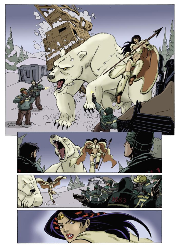 Today's the day, peoples of the world! I wanted to share a few pages with you before you all go out and buy 20 copies, but not being sure what I could and couldn't show I went with the two pages that were for sure on line before now, pages 3-5, where Nanook of the North lays siege to a clandestine drilling operation in northern BC, and runs afoul of our villain, the Red Rogue. By now you're hooked beyond all capacity for rational thought, so I'll leave you to rush out and get your copy, dear reader!